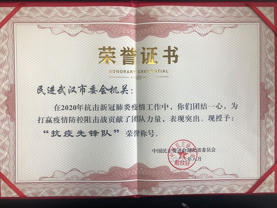 为表彰先进,弘扬正气,2020年8月30日,民进湖北省委会发布关于表彰“抗疫先锋队”和“抗疫先锋”的决定,授予民进武汉市委会机关及民进武汉市洪山区工委等6个基层组织“抗疫先锋队”称号,罗光伟等34名同志“抗疫先锋”称号。