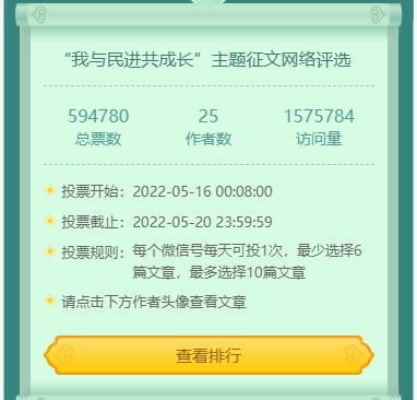 为巩固党史学习教育活动成果,积极开展“矢志不渝跟党走,携手奋进新时代”政治交接主题教育活动,进一步凝聚共识、汇聚力量,为武汉打造新时代英雄城市作出更大贡献,民进武汉市委会开展了庆祝五四青年节、喜迎中共二十大“我与民进共成长”主题征文活动,广大会员积极参与,共收到征文40余篇,经专家评审选出25篇入围作品于5月16日至20日进行了为期5天的网络评选。