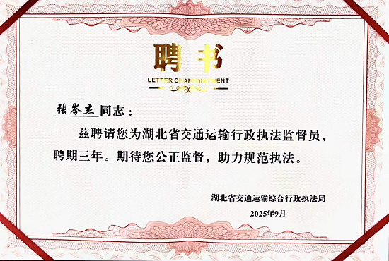 近日,湖北省交通运输综合行政执法局正式聘任首批15名交通运输行政执法监督员,民进武汉市直属汉口学院支部副主委张岑杰受聘履职。