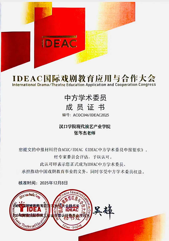 近日,2025 IDEA国际戏剧/剧场与教育联盟亚太论坛暨第十一届IDEAC国际戏剧教育应用与合作大会在中央戏剧学院昌平校区召开。民进武汉市委会直属汉口学院支部副主委、汉口学院现代演艺产业学院主任张岑杰,成功当选IDEAC中方学术研究实践工作委员会委员。