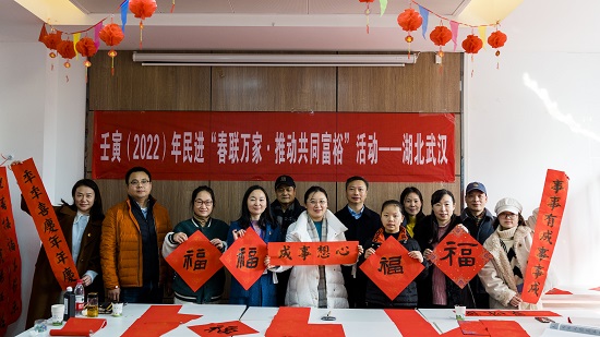 为贯彻落实中共十九届六中全会和民进十四届五中全会精神,发挥民进文化界别优势,服务街道基层社会治理,助力基层文化建设,2022年1月16日上午,民进洪山区工委联合区文联在结对共建街道洪山街三鸿社区组织开展了“壬寅(2022)年民进春联万家•推动共同富裕”活动。民进洪山区工委主委周蜜、委员许龙才、民进市委会宣传部负责人吴俊及区文联副主席陈迪炎、三鸿社区书记刘芬等参加活动。