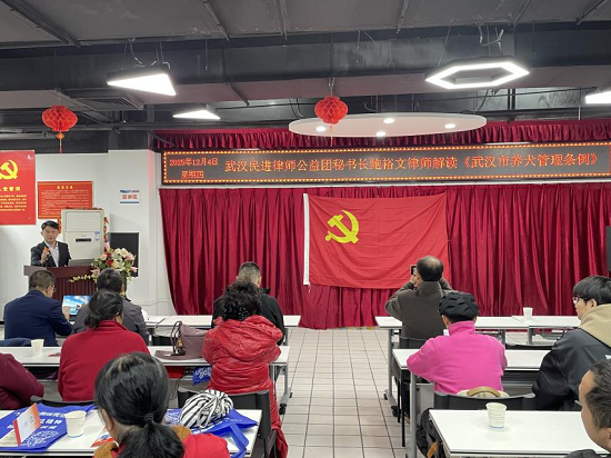 武汉民进律师公益团成员在团长燕非的带队下,围绕群众关心的热点问题,展开了细致入微的法律解读。民进会员、北京大成(武汉)律师事务所律师黄俊结合典型案例,深入浅出地讲解了《住房租赁条例》,针对租赁合同、租金纠纷、押金退还等常见问题给出专业建议,帮助居民规避租房风险,维护自身权益。民进会员、上海段和段(武汉)律师事务所合伙人、公益团秘书长鲍裕文律师聚焦社区治理难点,系统解读了即将于2026年1月1日施行的《武汉市养犬管理条例》,从登记管理、行为规范、法律责任等方面进行说明,倡导依法文明养犬,共建和谐社区环境。